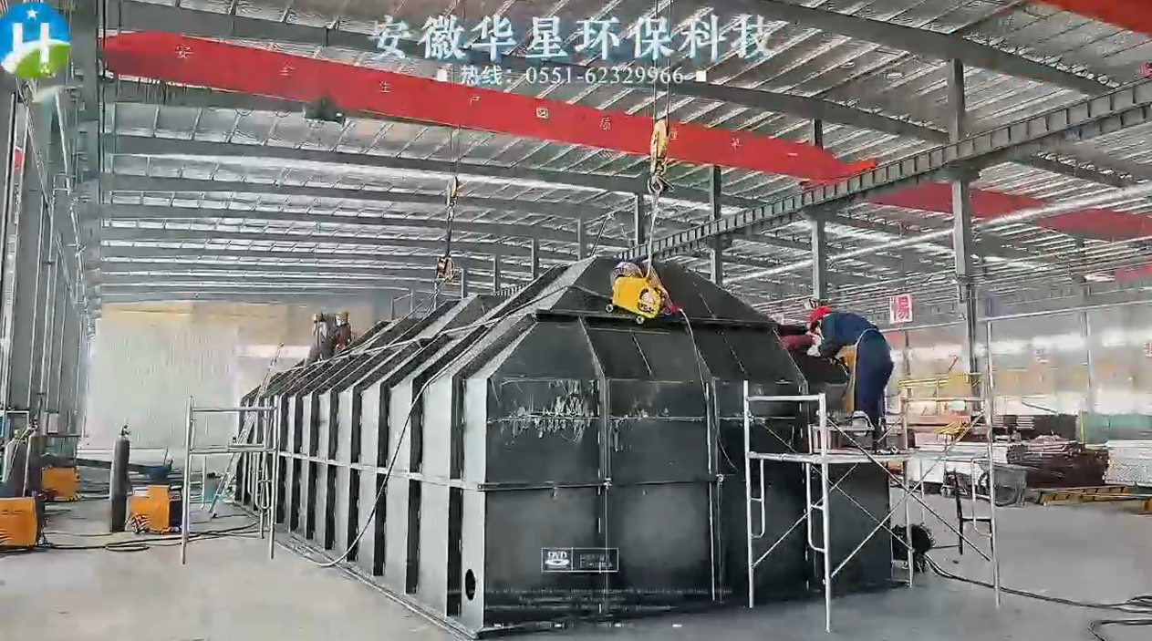 3、污水处理设备各池体钢结构加工已完工,已开始进行玻璃钢防腐、表面涂装及内部填料填充施工